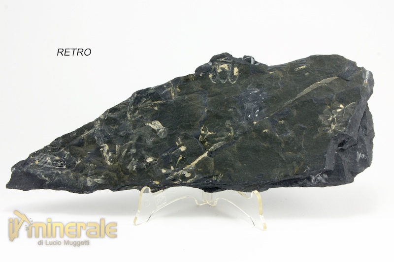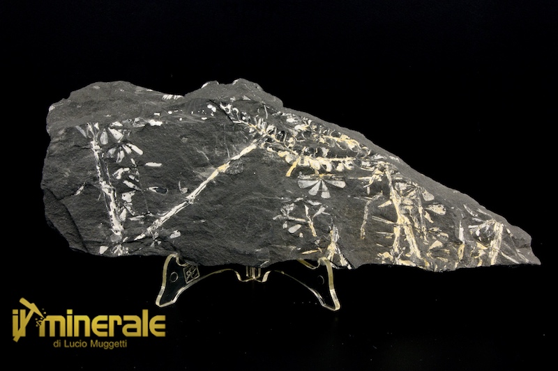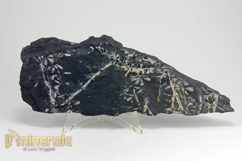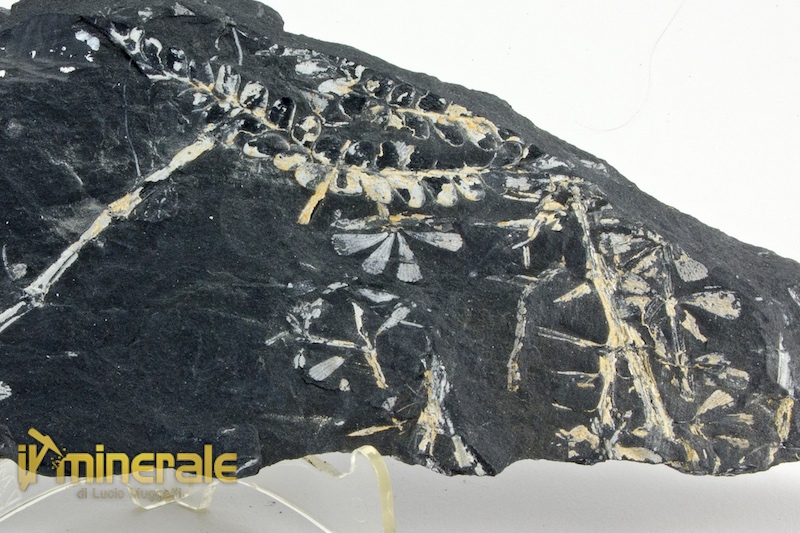 Felce fossile "Sphenophillum oblongifolium". Il rivestimento bianco che si nota su questi fossili è "pirofillite", un minerale tipo talco che ha sostituito parte della materia vegetale