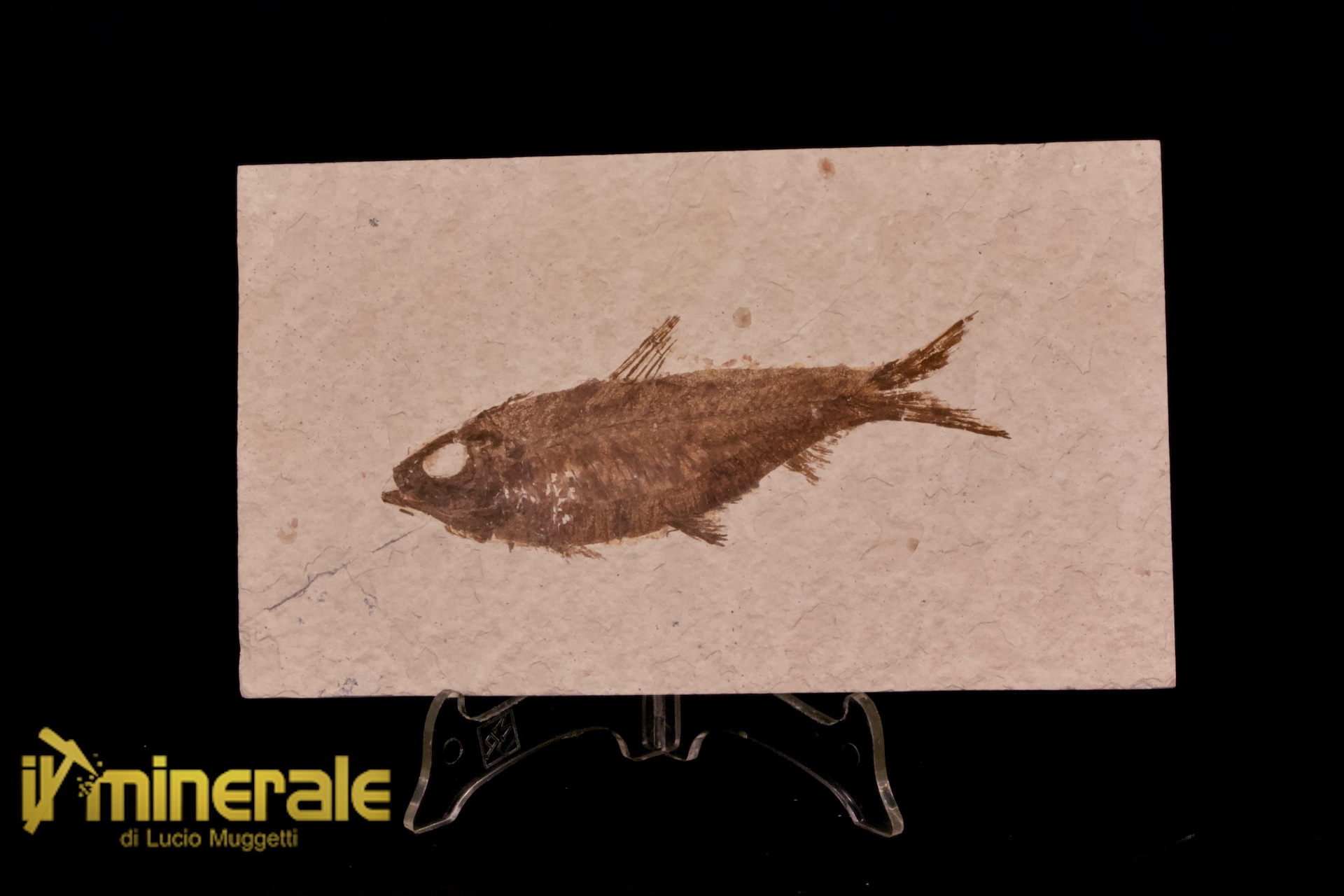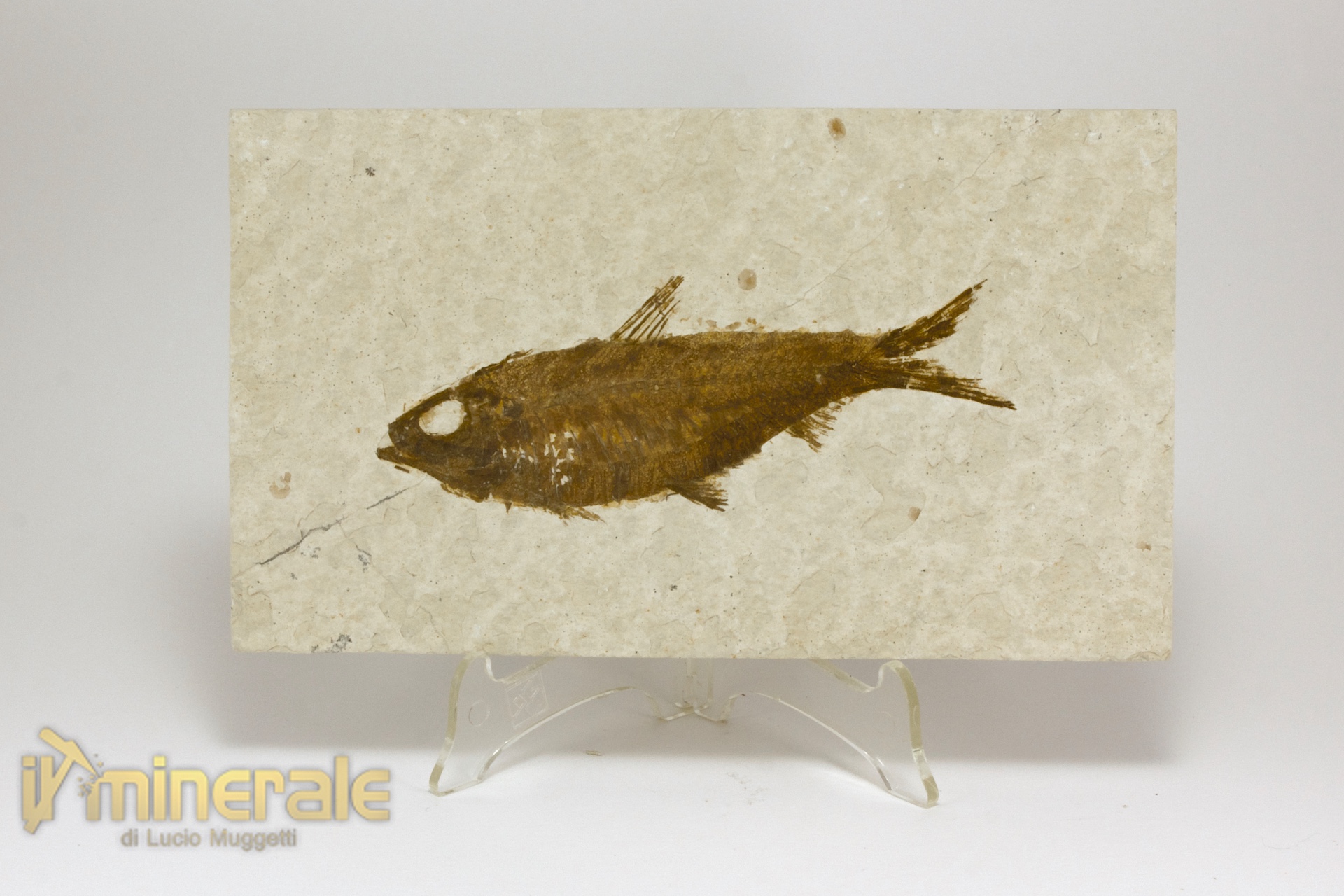 Pesce fossile "Knightia eocaena"; la lastra è intera, nessun restauro.