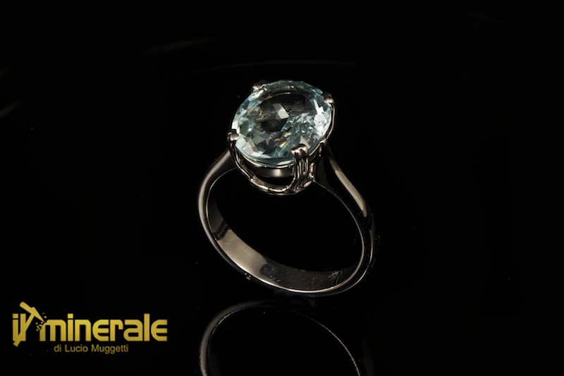 Anello in oro bianco 18 Kt con un'acquamarina sfaccettata di taglio ovale della dimensione di 9x11 mm
