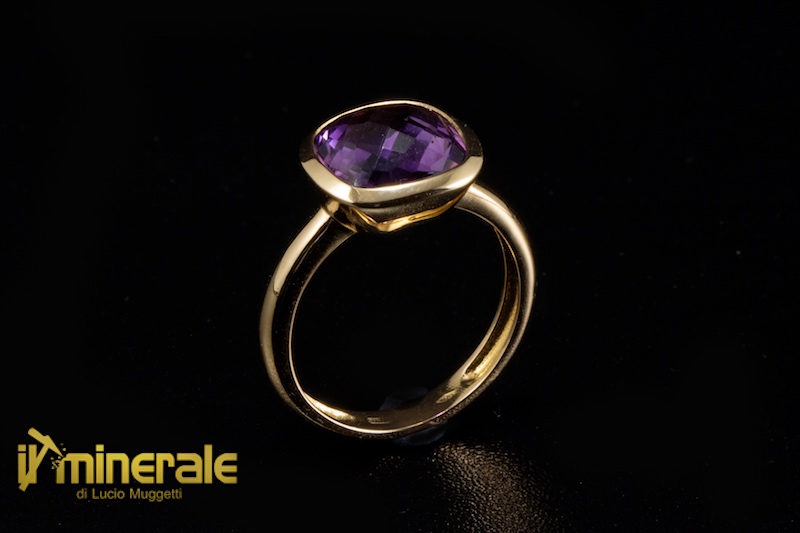 Anello in oro rosa 18 Kt con una briolette sfaccettata di forma quadrata di ametista della dimensione di 10x10 mm