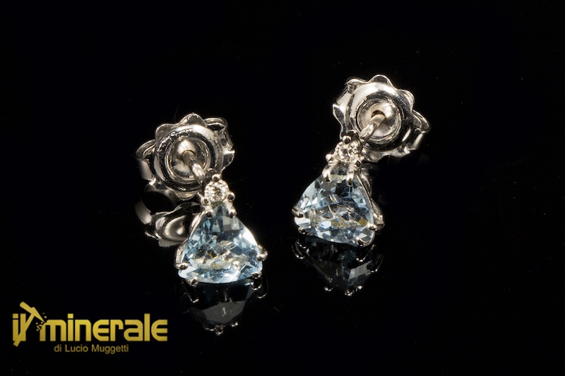 Orecchini a pressione in oro bianco 18 Kt con acquamarine triangolari della dimensione di 6x6 mm (peso 1,50 Kt) e due piccoli  brillanti (0,02 Kt)