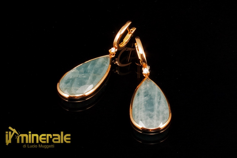 Orecchini pendenti in oro rosa 18 Kt con cabochon sfaccettati di acquamarina lattea a forma di goccia della dimensione di 28x14 mm e due brillanti dal peso totale di 0,02 Kt