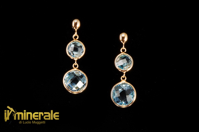 Orecchini a pressione pendenti in oro rosa 18 Kt con briolette sfaccettate tonde di topazio azzurro del diametro di 5 e 7 mm