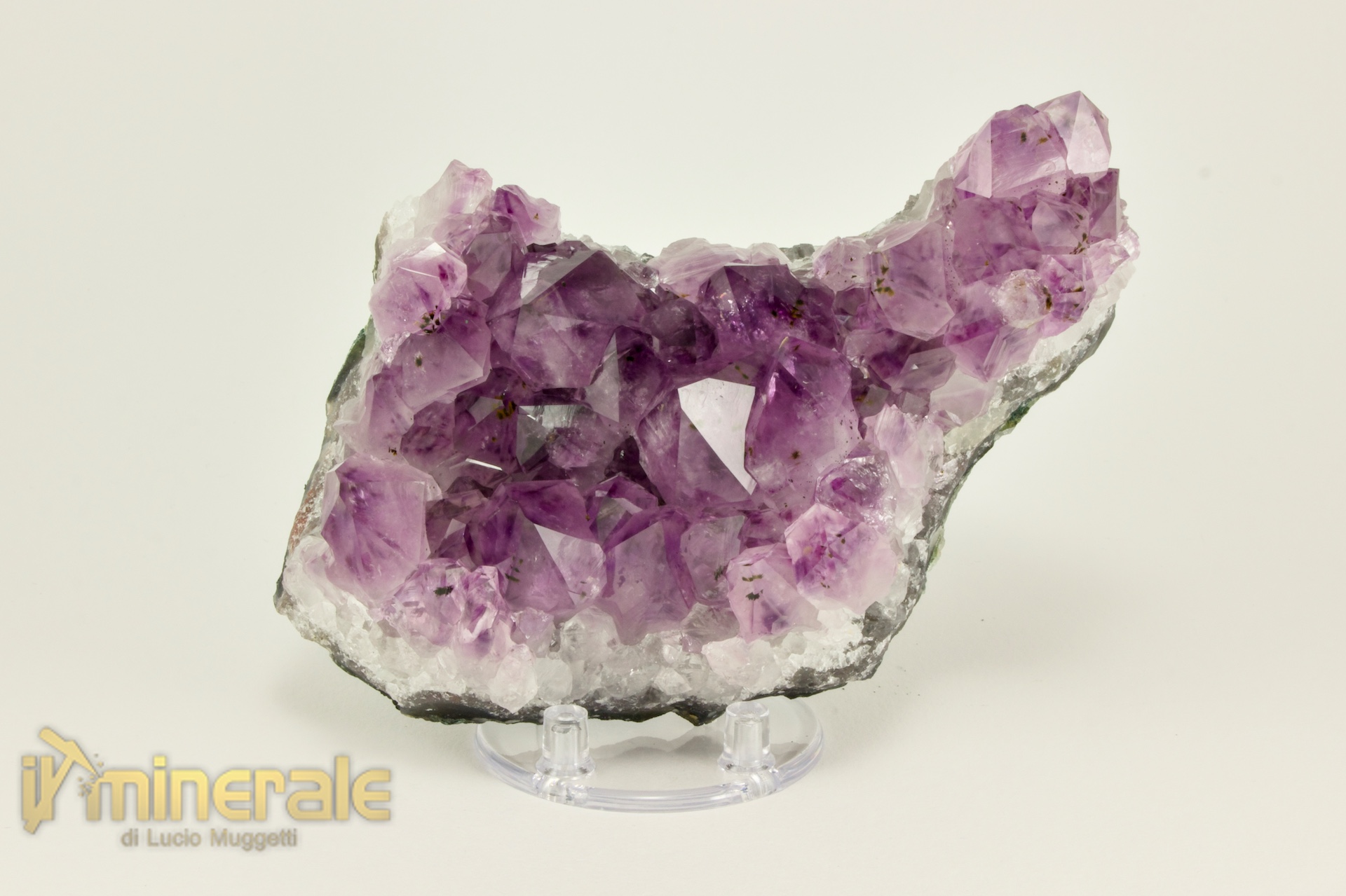 Ametista: drusa con cristalli centimetrici (massimo 2,5 cm) viola trasparenti di abito prismatico pseudoesagonale con lucentezza vitrea e con evidenti inclusioni di cristaali aciculari di RUTILO