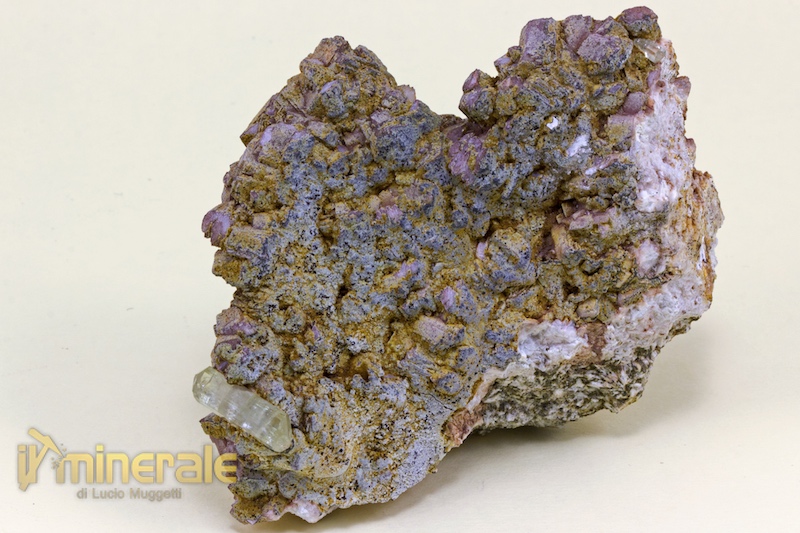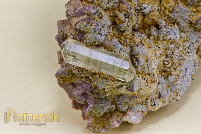 Cristallo prismatico esagonale a doppia terminazione (1,8x0,5 cm) di colore giallo-verde semitrasparente con lucentezza vitrea su feldspato