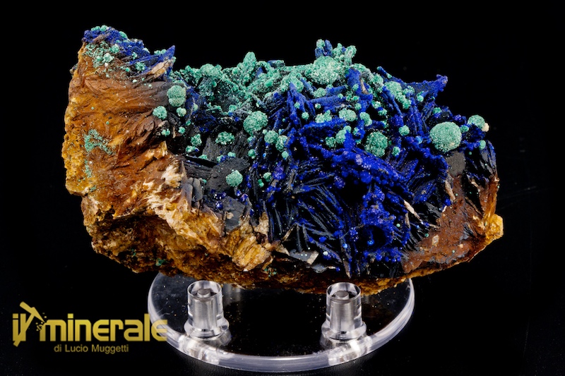 Drusa composta da cristalli millimetrici dal colore blu intenso, traslucidi con pronunciata lucentezza vitrea. Il campione presenta anche piccoli cristalli di malachite riuniti in aggregati fibrosi pseudosferici verdi con lucentezza sericea. La matrice è barite compatta o con cristalli lamellari appena accennati