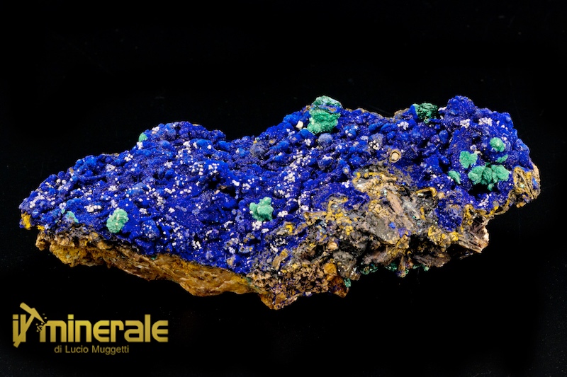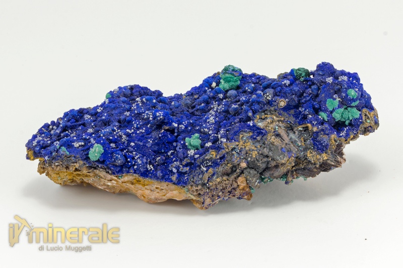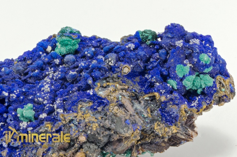 Drusa composta da cristalli millimetrici dal colore blu intenso, traslucidi con pronunciata lucentezza vitrea. Il campione presenta anche piccoli cristalli di malachite riuniti in aggregati fibrosi pseudosferici verdi con lucentezza sericea. La matrice è barite compatta o con cristalli lamellari appena accennati