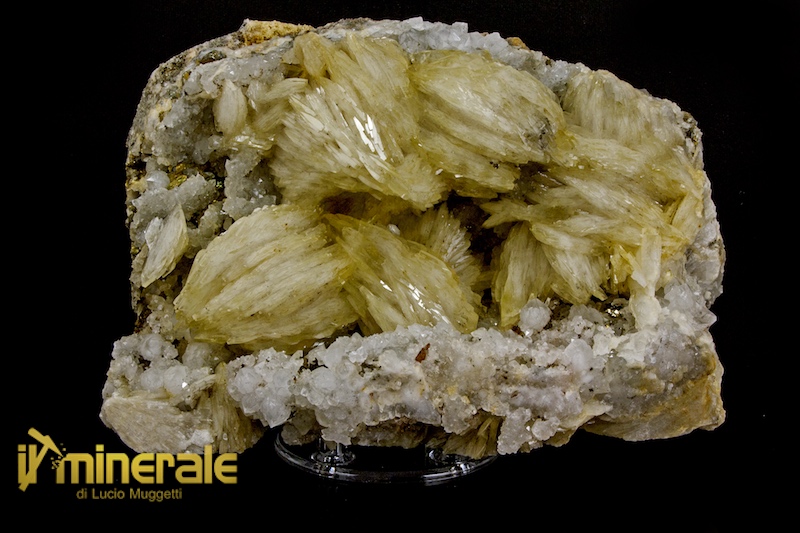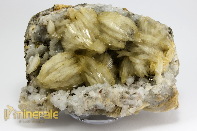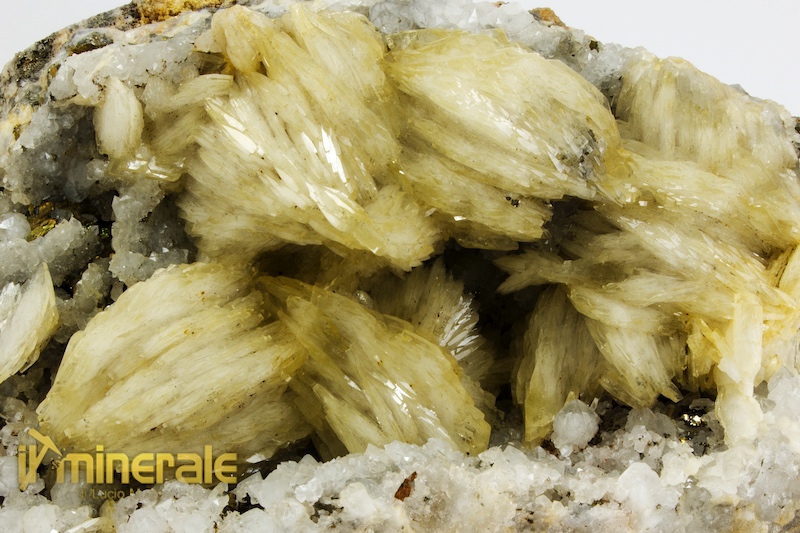 Cristalli lamellari centimetrici (massimo 6 cm) in accrescinmento parallelo, semitrasparenti con lucentezza vitrea ed associati a pirite e quarzo ialino