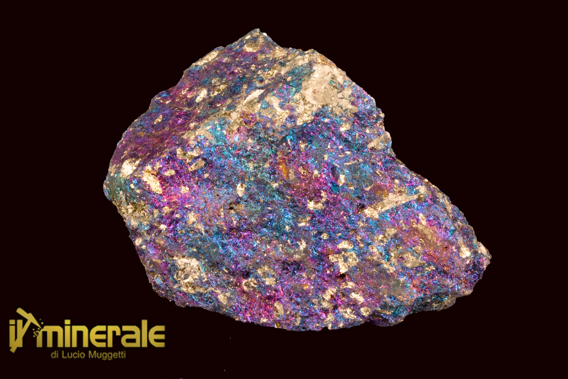 Massa compatta ed opaca con lucentezza metallica di colore marrone chiaro con forte iridescenza dai toni che vanno dal viola al blu elettrico al giallo oro