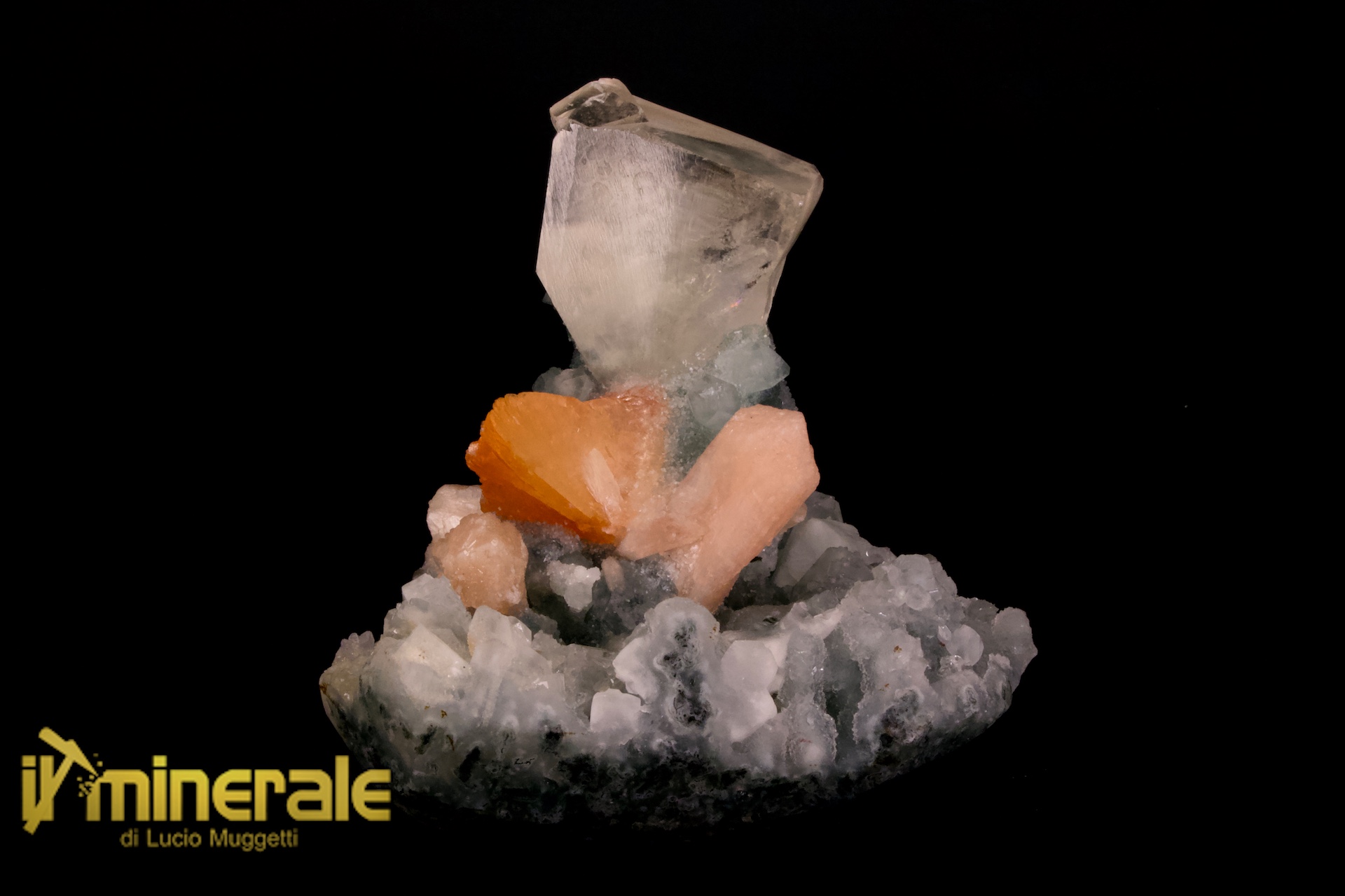 Grande cristallo di calcite semi-trasparente (5x3,1x4,5 cm) con, alla base, un aggregato di cristalli lamellari di heulandite anch'essa semi-trasparente e di colore rosa intenso (3x3x4 cm). In associazione vi sono cristalli centimetrici di stilbite rosa (massimo 4,5 cm) e cristalli centimetrici di apofillite trasparente