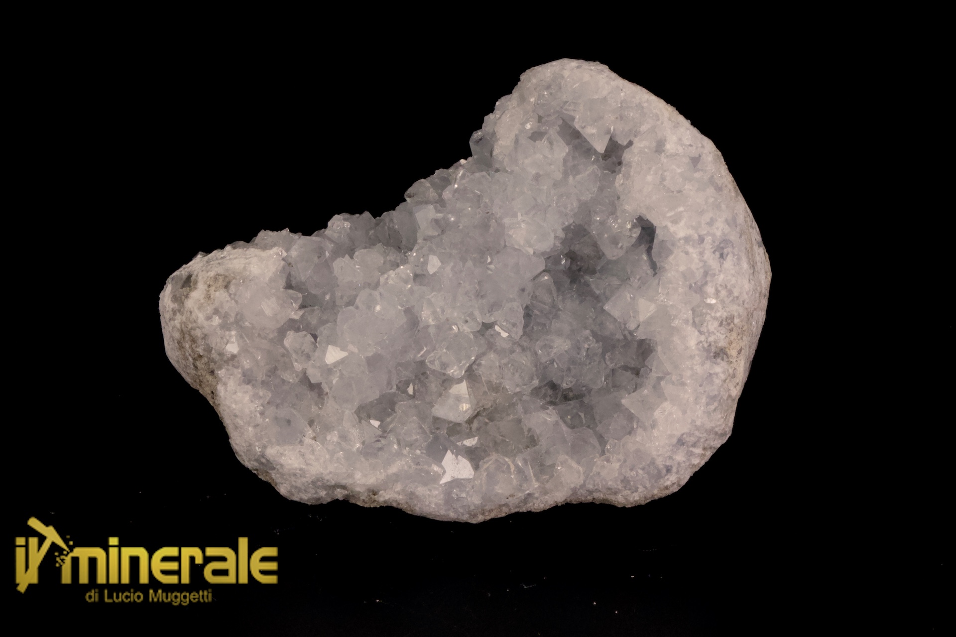 Celestina: fitta drusa di cristalli millimetrici da trasparenti a semitrasparenti, di habitus prismatico con lucentezza vitrea accentuata e di colore azzurro chiaro
