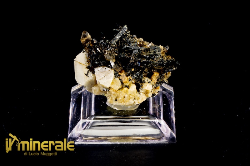 Cristalli sub-centimetrici di egirina verde scuro tendente al nero di abito prismatico monoclino con ortoclasio e quarzo fumè