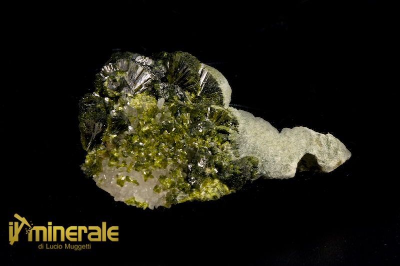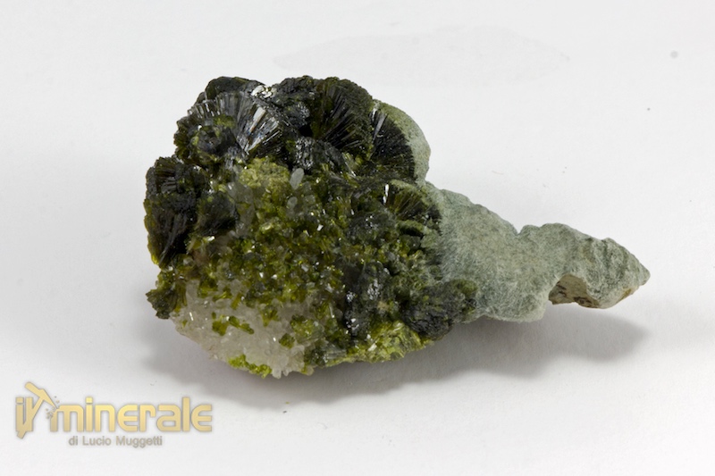 Fitta drusa di cristalli centimetrici e sub-centimetrici di Epidoto propriamente detto di colore verde scuro con lucentezza sericea. In associazione piccoli cristalli di quarzo ialino