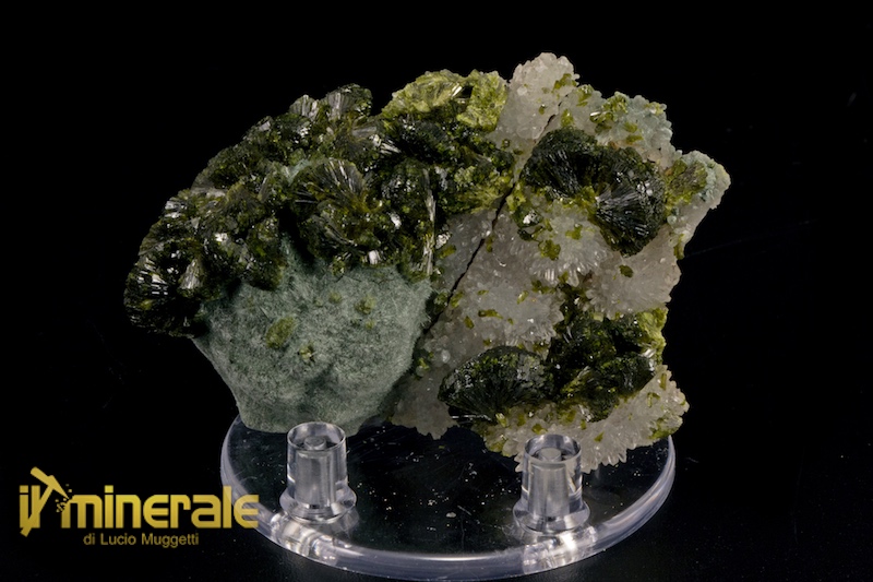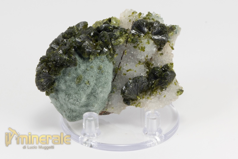 Fitta drusa di cristalli centimetrici e sub-centimetrici di Epidoto propriamente detto di colore verde scuro con lucentezza sericea. In associazione piccoli cristalli di quarzo ialino