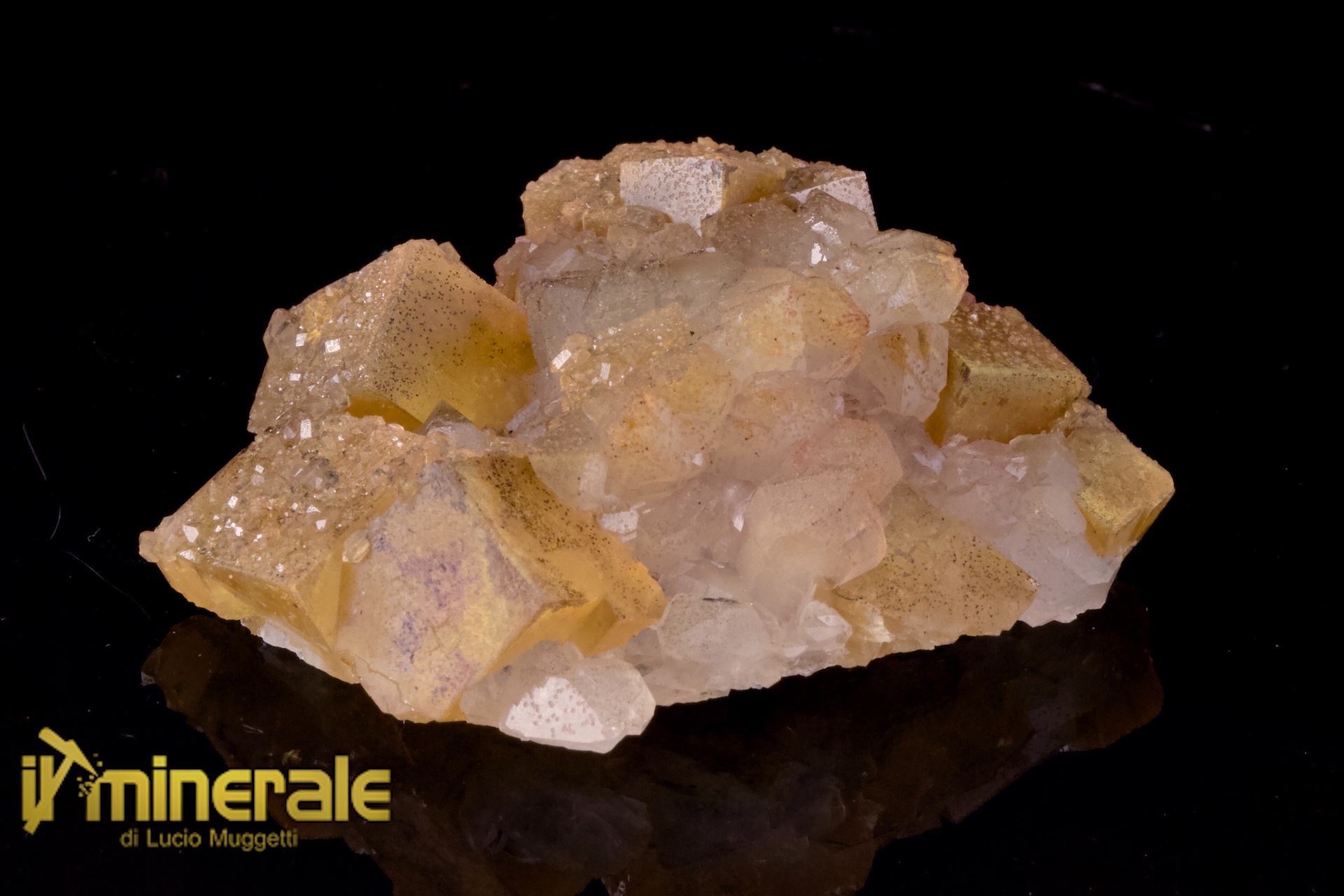 Fluorite gialla in cristalli centimetrici cubici fittamente compenetrati (Massimo 1,2 cm) con forte fluorescemnza viola