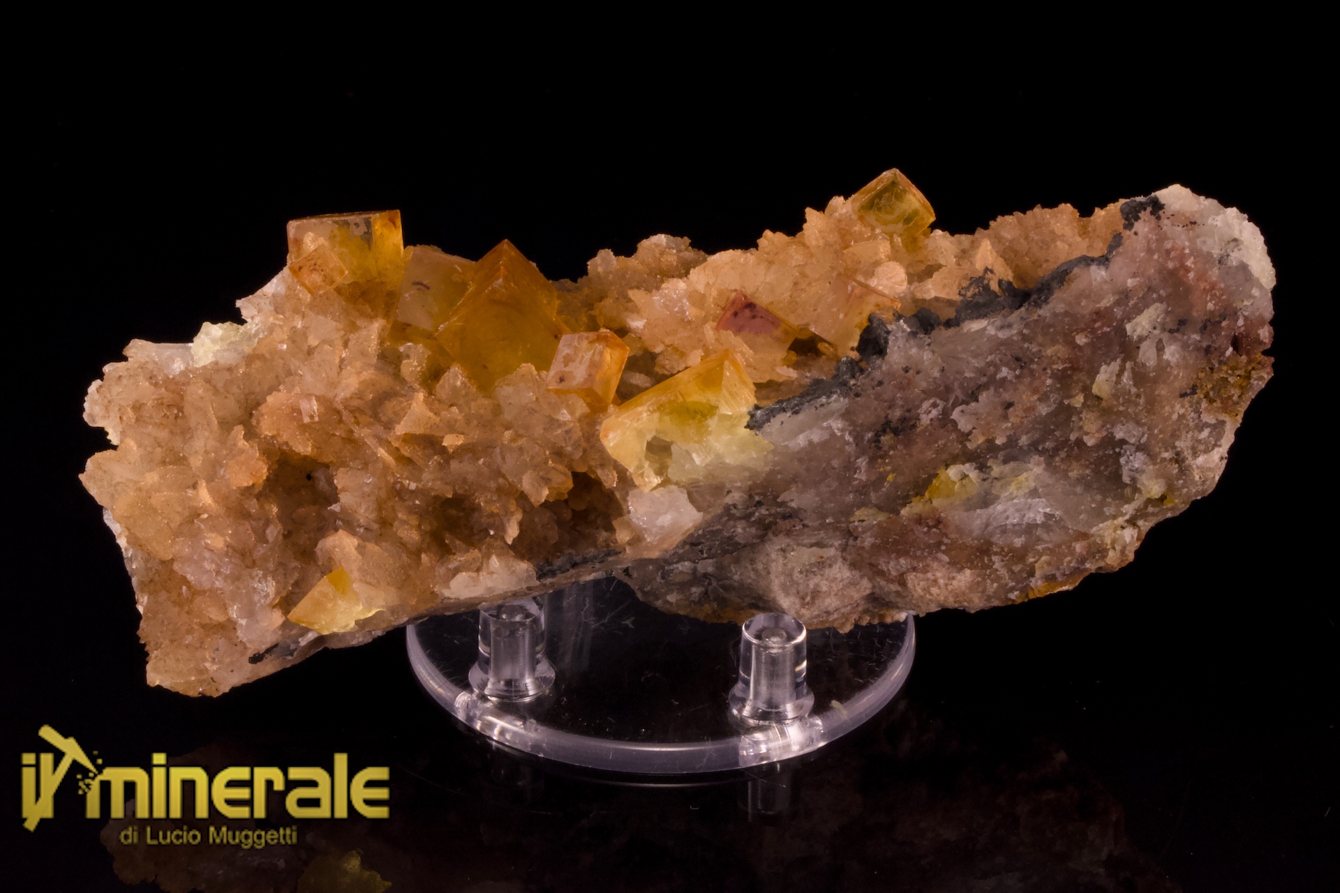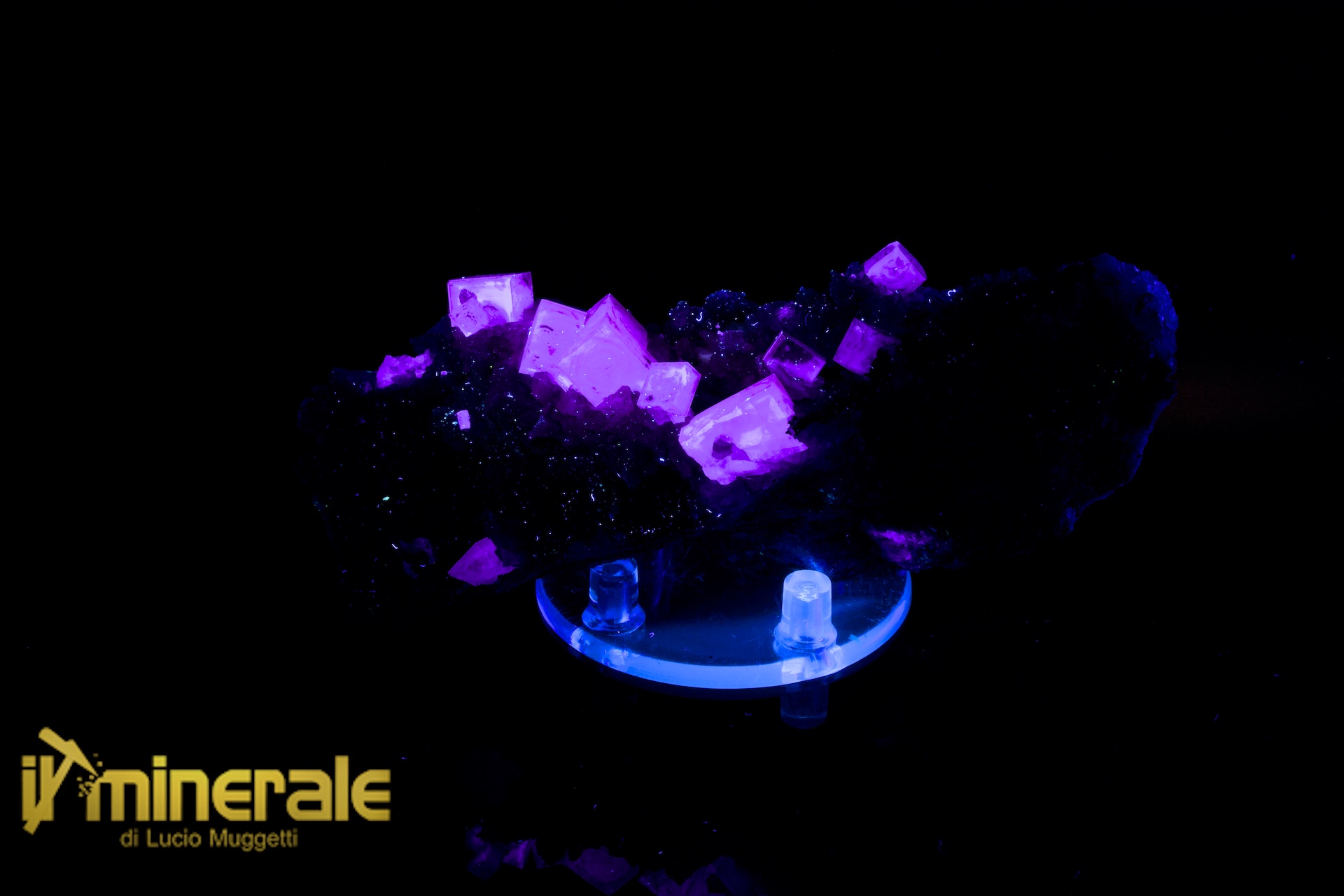 Fluorite gialla in cristalli centimetrici cubici fittamente compenetrati (Massimo 1,2 cm) con forte fluorescemnza viola