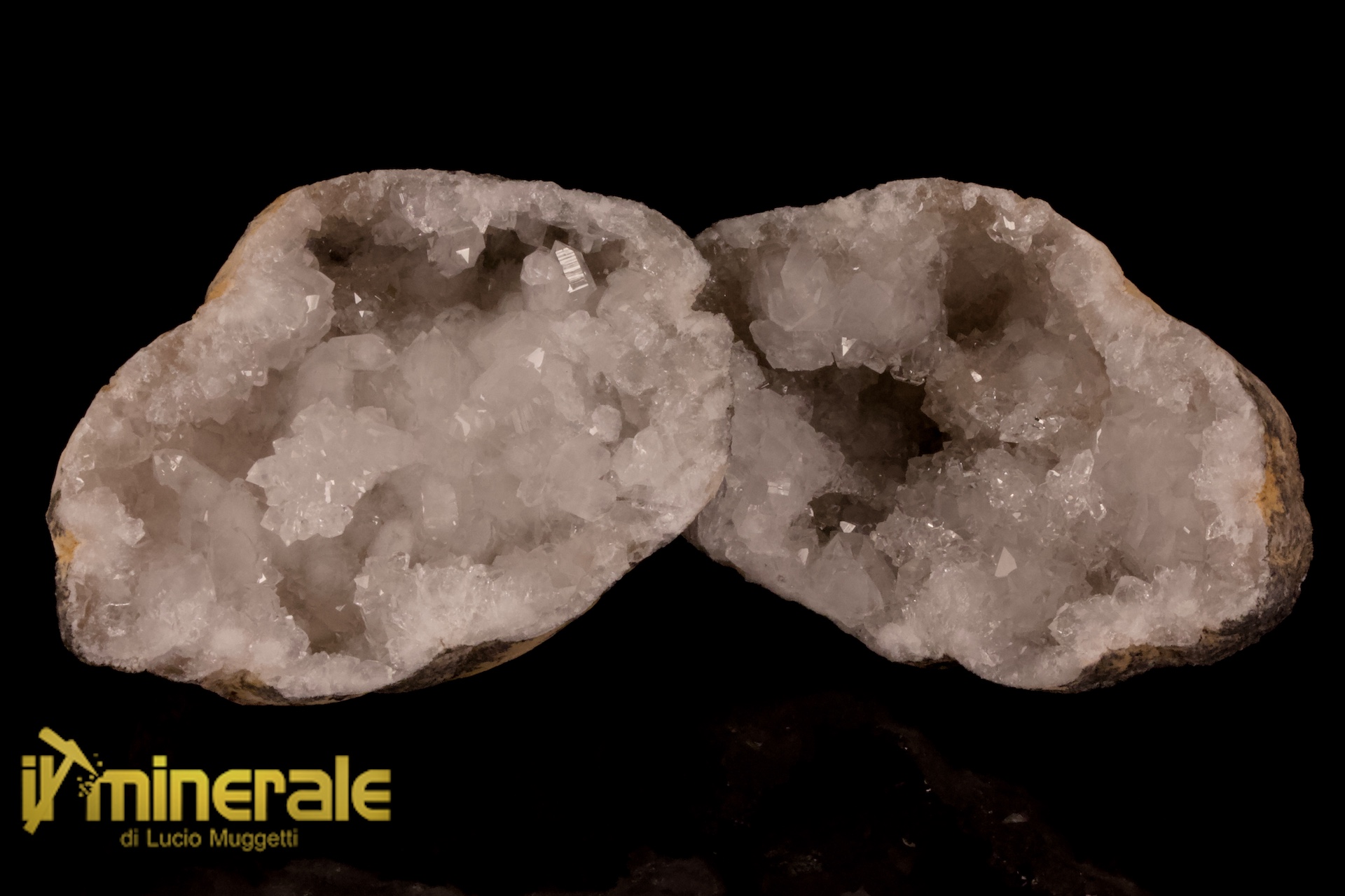 Geode intero con piccoli cristalli di calcite bianca da trasparente a traslucida e cristalli più grandi di quarzo ialino e latteo