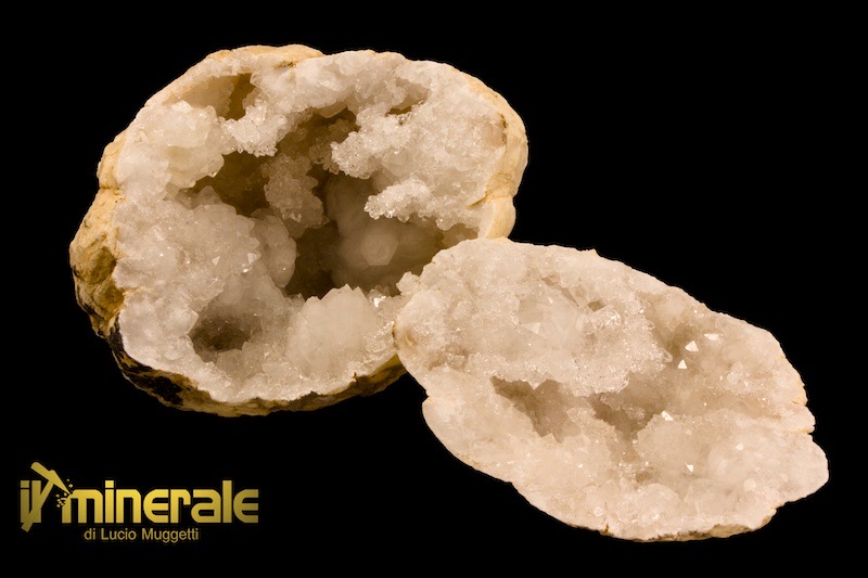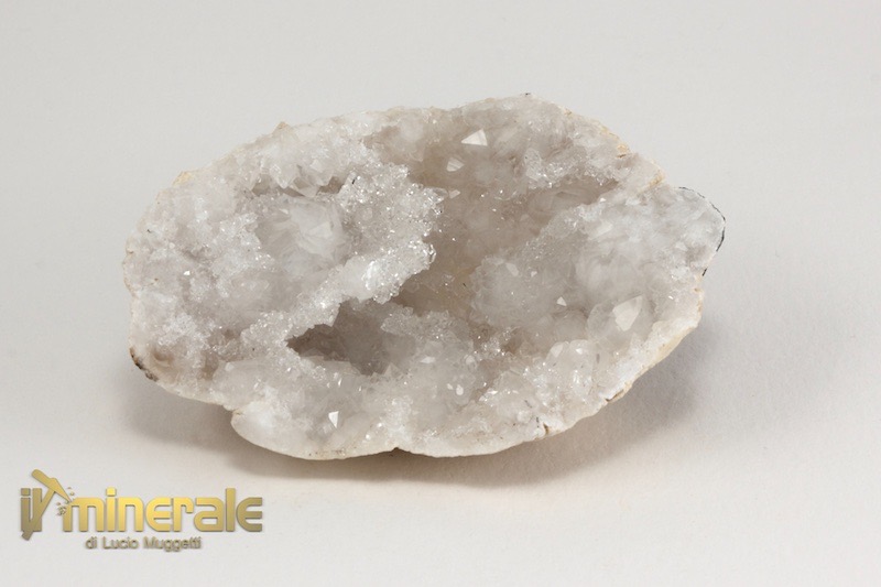 Geode intero con piccoli cristalli di calcite bianca da trasparente a traslucida e cristalli più grandi di quarzo ialino e latteo