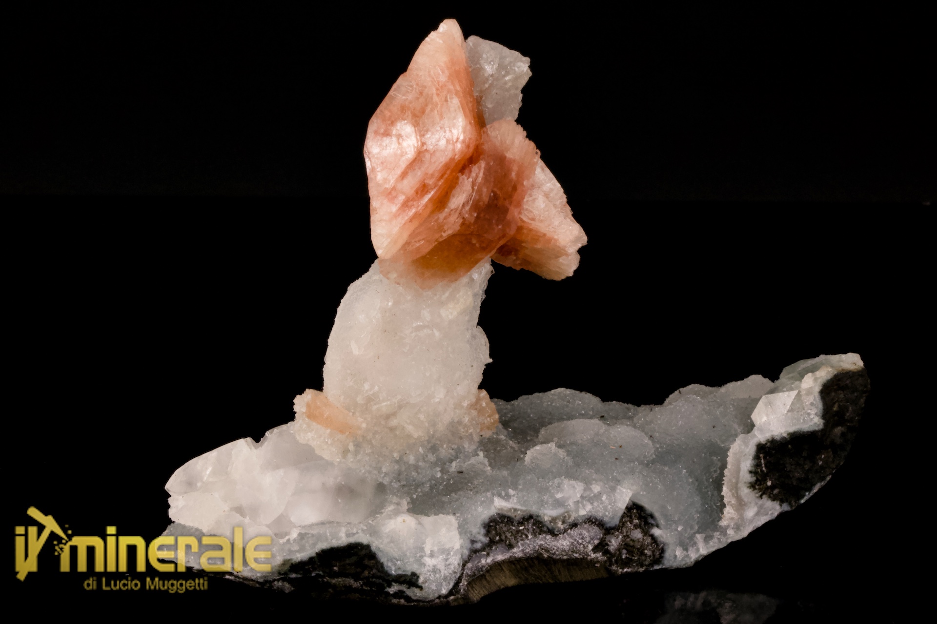 Cristalli prismatici di colore aranciato riuniti a costituire aggregati a forma di scalpello (dimensione massima 3 cm) che poggiano su una piccola stalattite di calcedonio