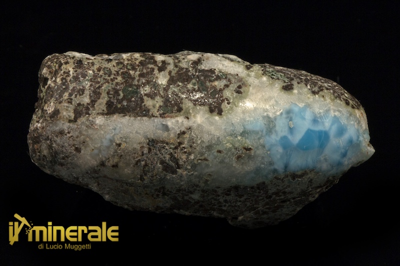 Varietà di pectolite (inosilicato di sodio e calcio) dal colore azzurro chiaro. Il campione è composto da straterelli lucidati in matrice