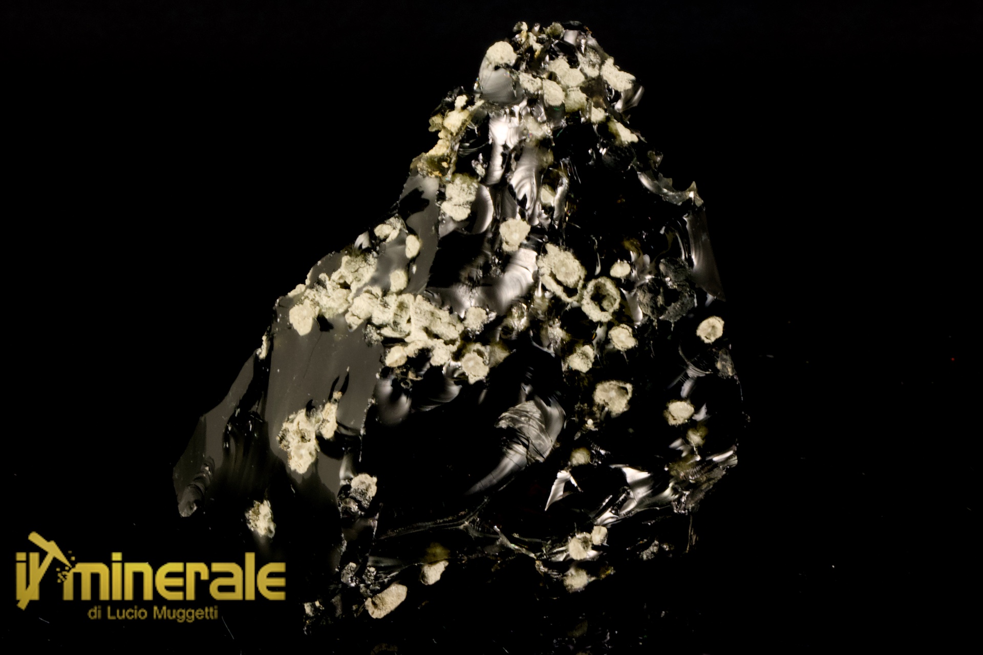 Campione massivo con superfici a spacco di ossidiana fiocco di neve (vetro naturale di origine vulcanica con inclusioni di piccole sferule bianco-grigie composte da cristobalite e feldspati)