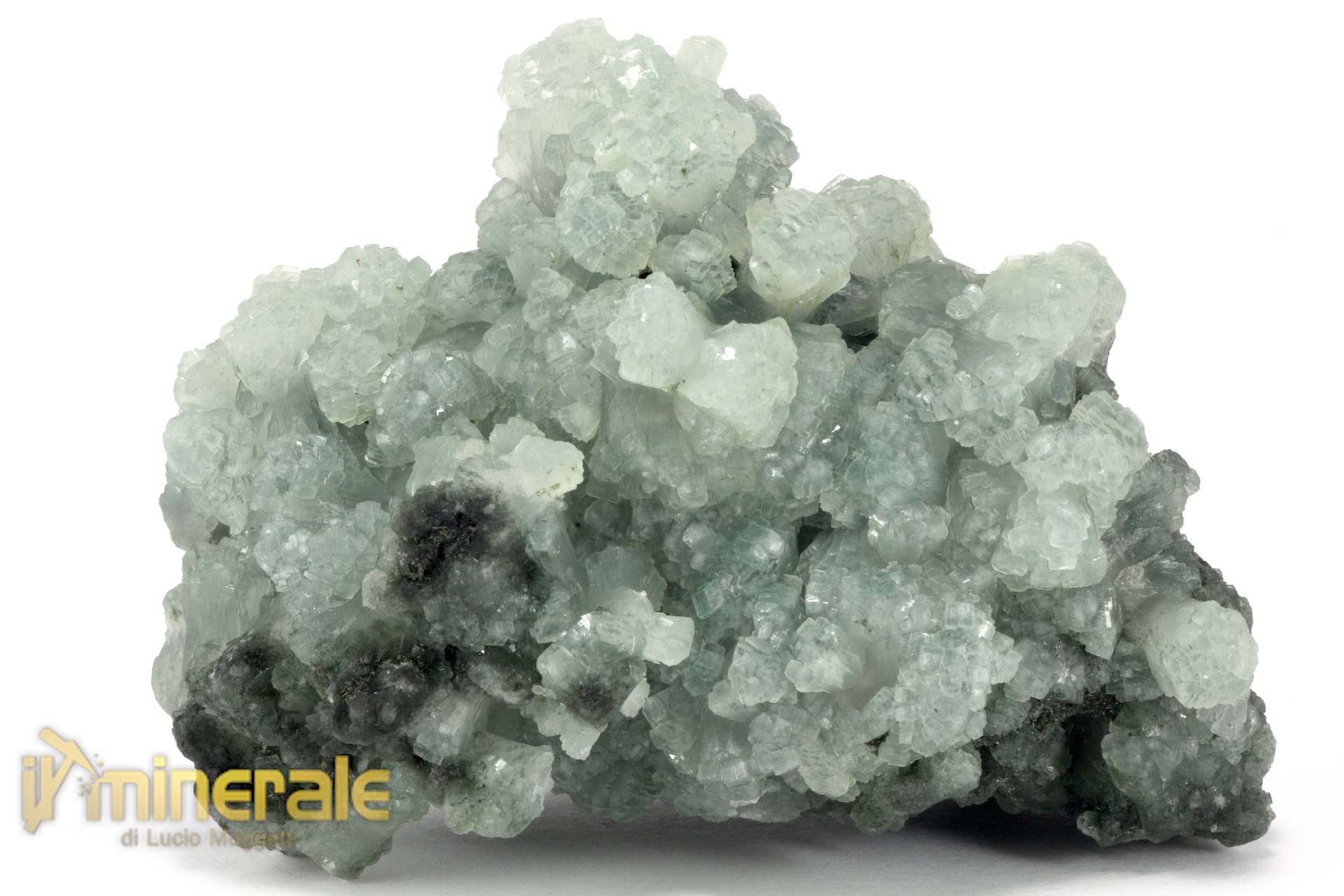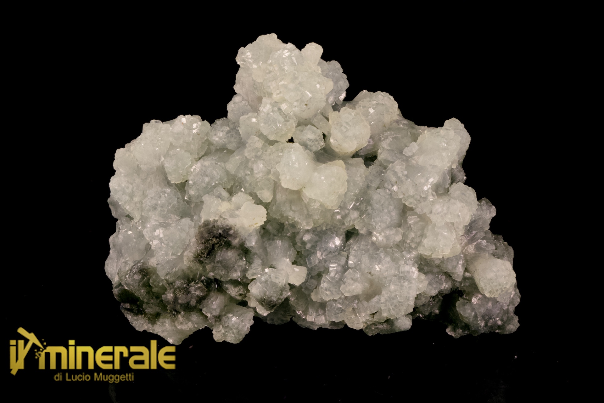 Prehnite: cristalli di colore verde chiaro centimetrici e sub-centimetrici fortemente appiattiti e riumiti in aggregati di varie forme