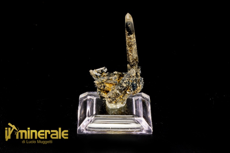 Lungo (3 cm) e sottile cristallo di quarzo fumè naturale con la punta trasparente su egirina