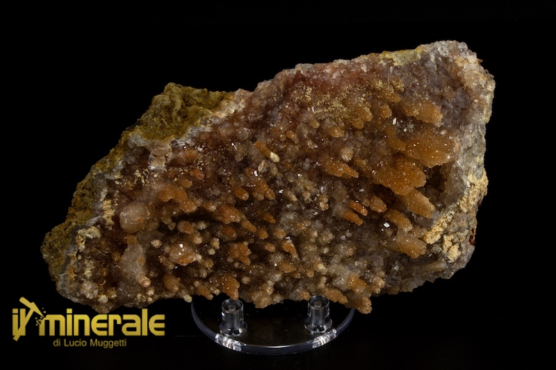 Porzione di geode con sottili stalattiti di calcedonio (altezza massima 2 cm) completamente rivestite da piccoli cristalli di quarzo di colore arancio per la presenza di ossidi di ferro