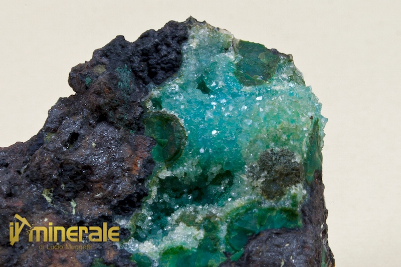 Microcristalli di quarzo trasparente che rivestono piccole incrostazione di crisocolla dal colore azzurro intenso