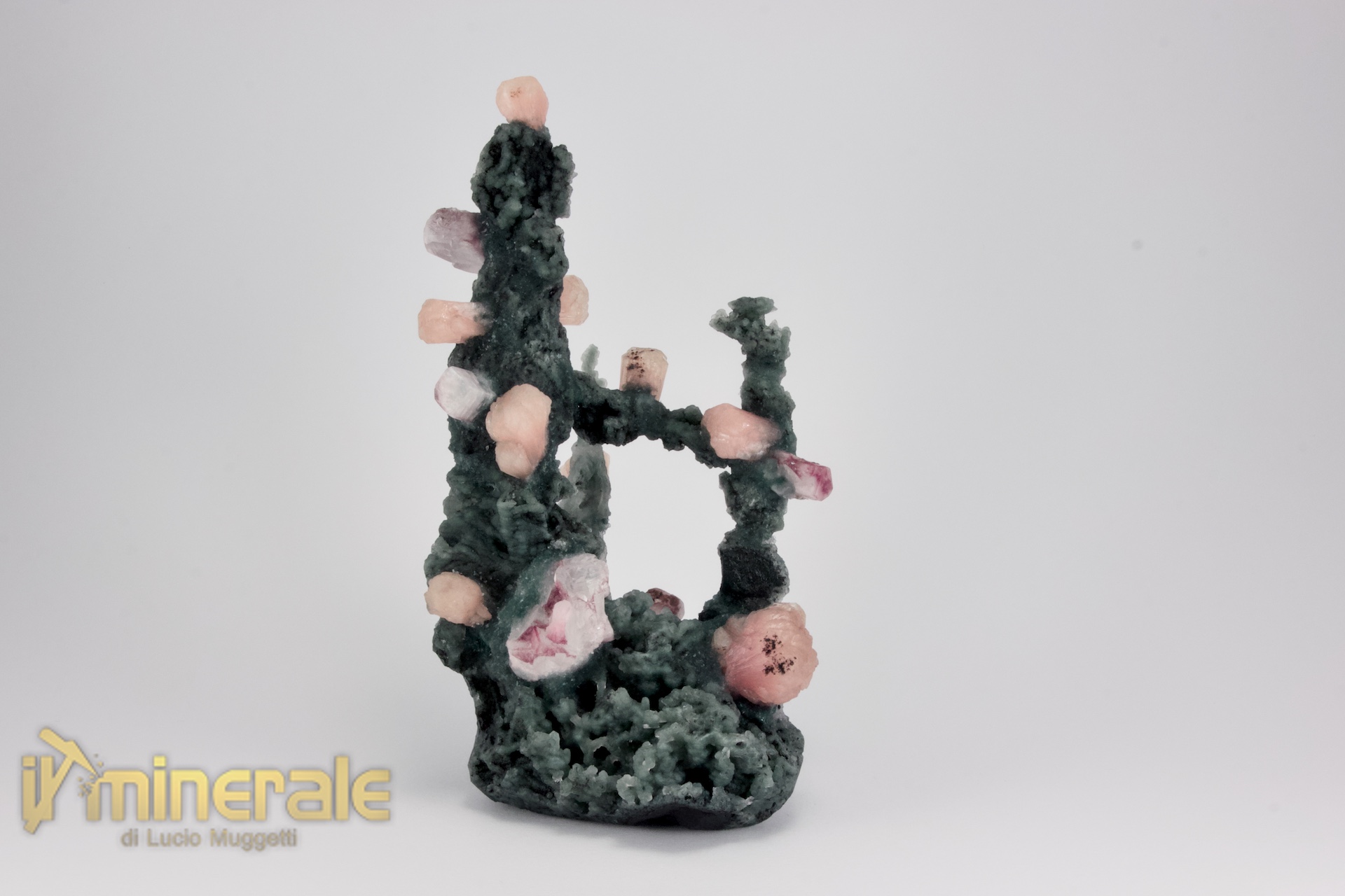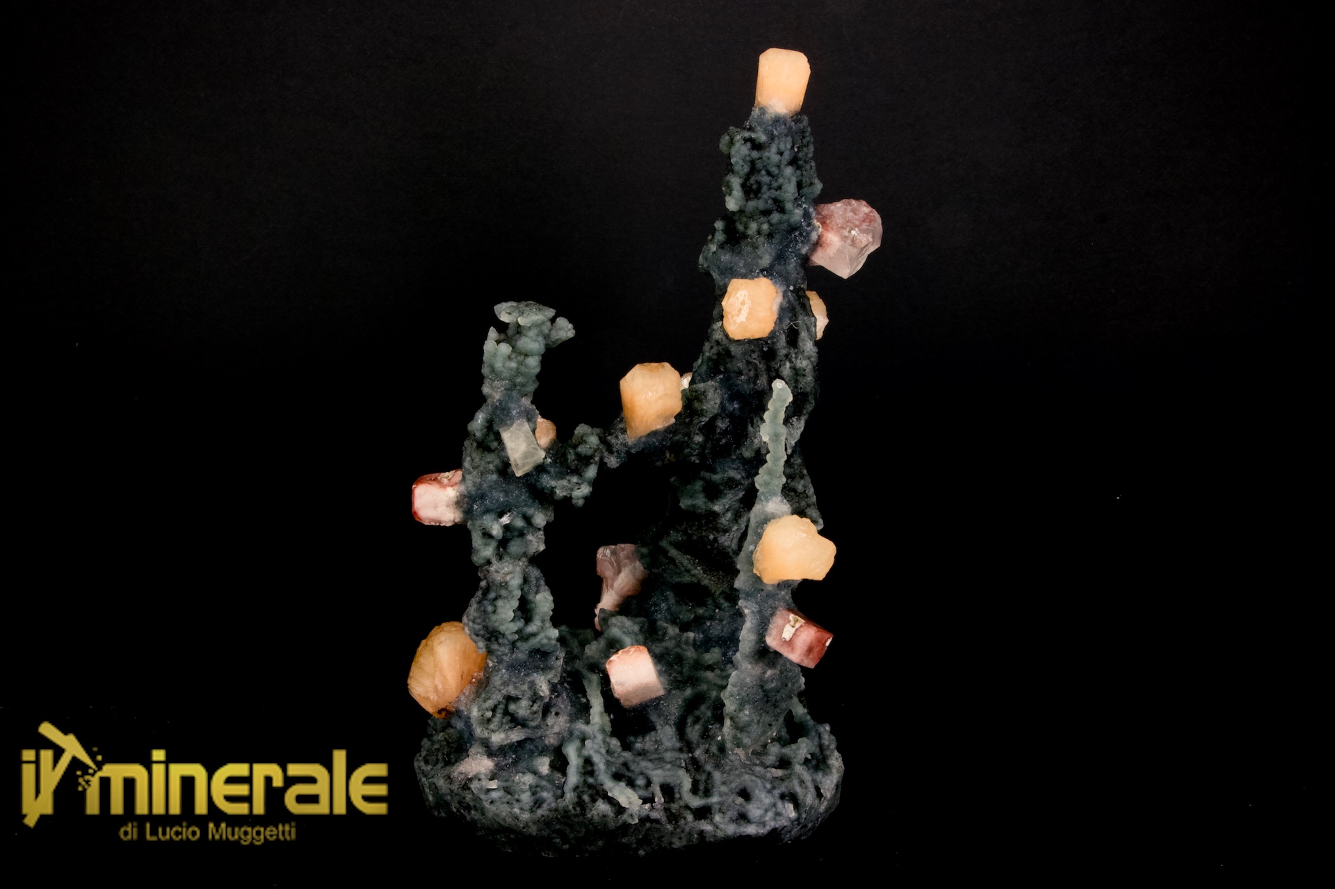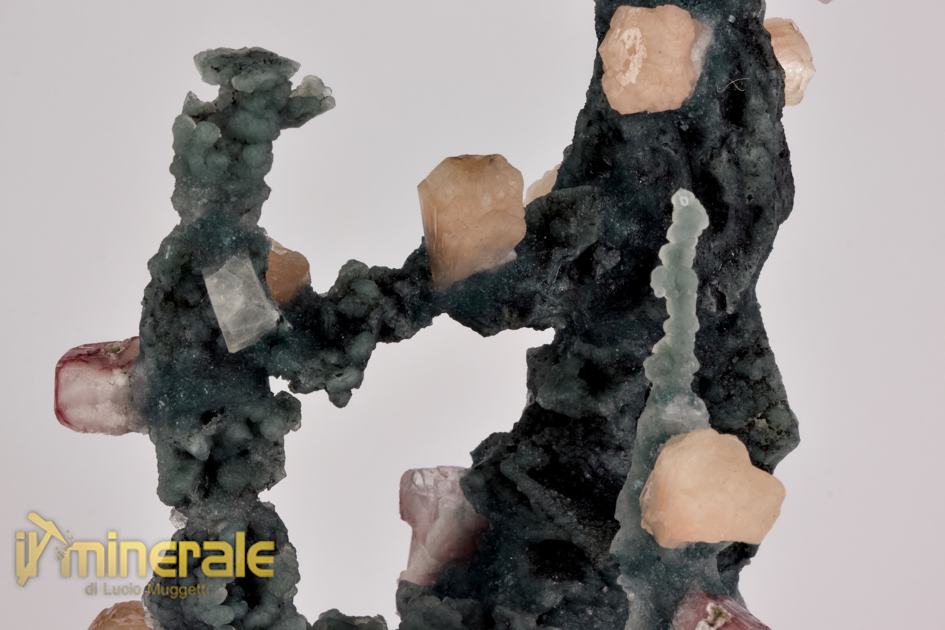 STELLERITE: rara zeolite del gruppo della stilbite. Il campione presenta cristalli appiattiti riuniti a covone di colore rosa salmone (massimo circa 1,3x1,6 cm) su stalattiti di calcedonio in associazione con cristalli isolati o compenetrati di calcite cubica