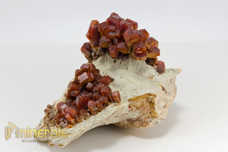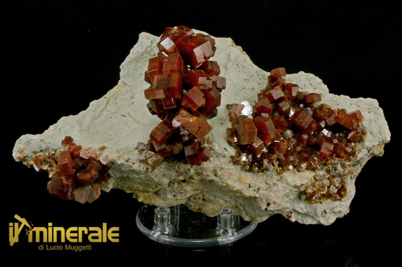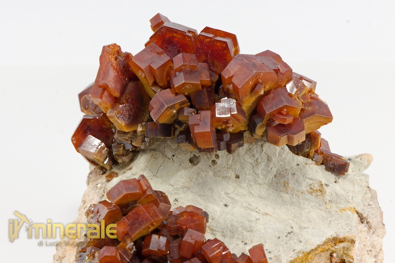 Vanadinite: bellissima drusa di cristalli con abito prismatico tozzo e tabulare con sezione esagonale; sono di dimensione centimetrica (massimo 1,5x1,0 cm) di colore rosso vivo con lucentezza sericea
