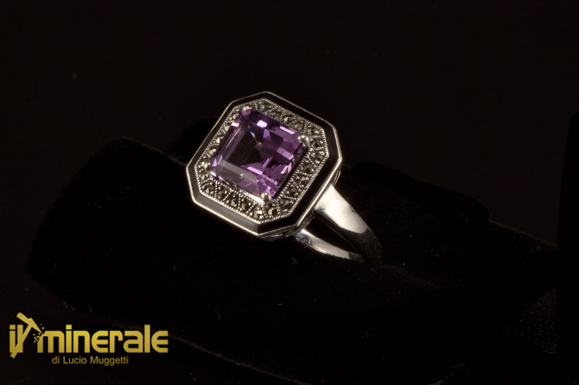 Anello in argento 925 con un carrè di ametista (8x8 mm), piccole marcassiti sfaccettate e smalto a fuoco di contorno