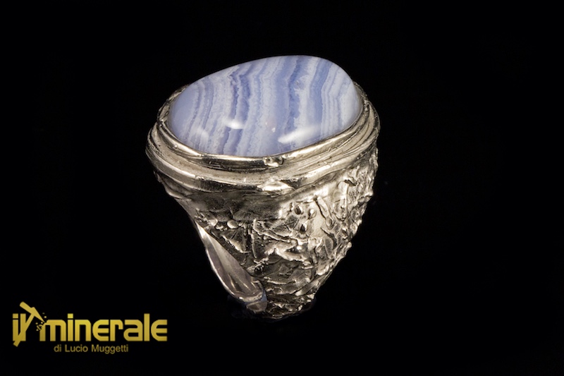 Anello in argento 925 rodiato con un cabochon di calcedonio azzurro della dimensione di 16x22 mm
