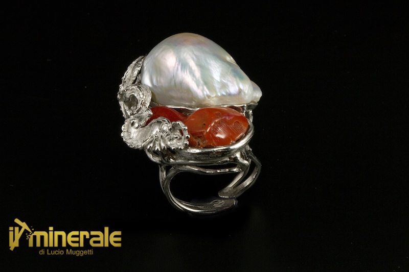 Anello in argento 925 rodiato con 2 elementi di corallo rosso grezzo di forma irregolare, una perla coltivata d'acqua dolce scaramazza ed incisioni in argento a forma di cavalluccio marino