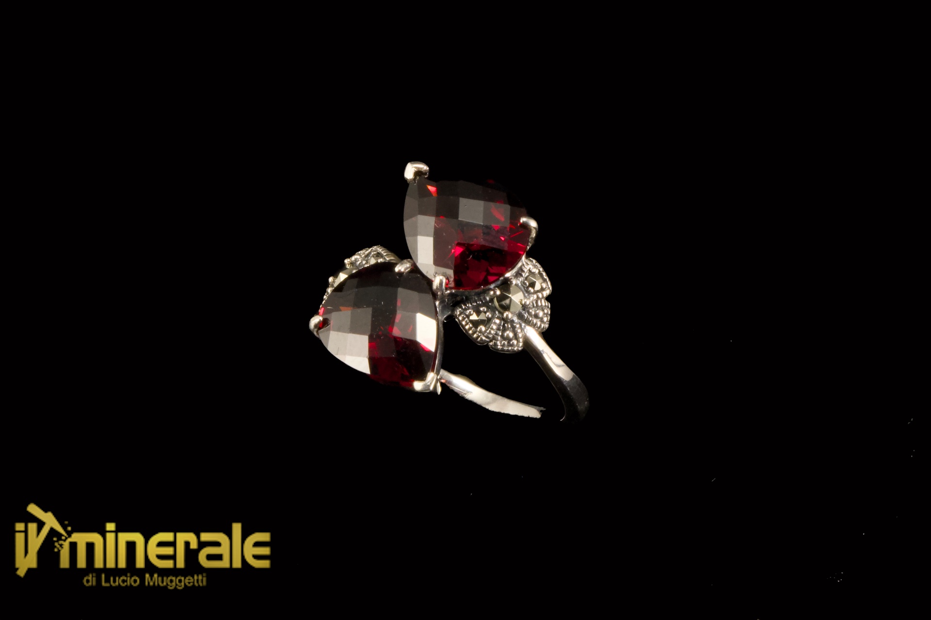 Anello contrariè in argento 925 con due briolette a forma di goccia di granato (8x10 mm) e piccole marcassiti sfaccettate
