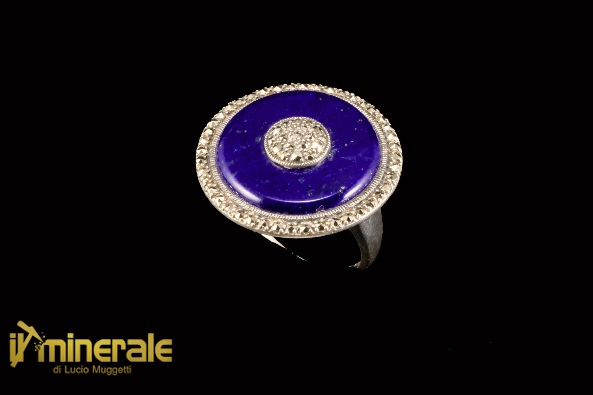 Anello in argento 925 con un disco di lapislazzuli del diametro di 20 mm con la parte centrale ed il bordo tempestate da piccole marcassiti sfaccettate