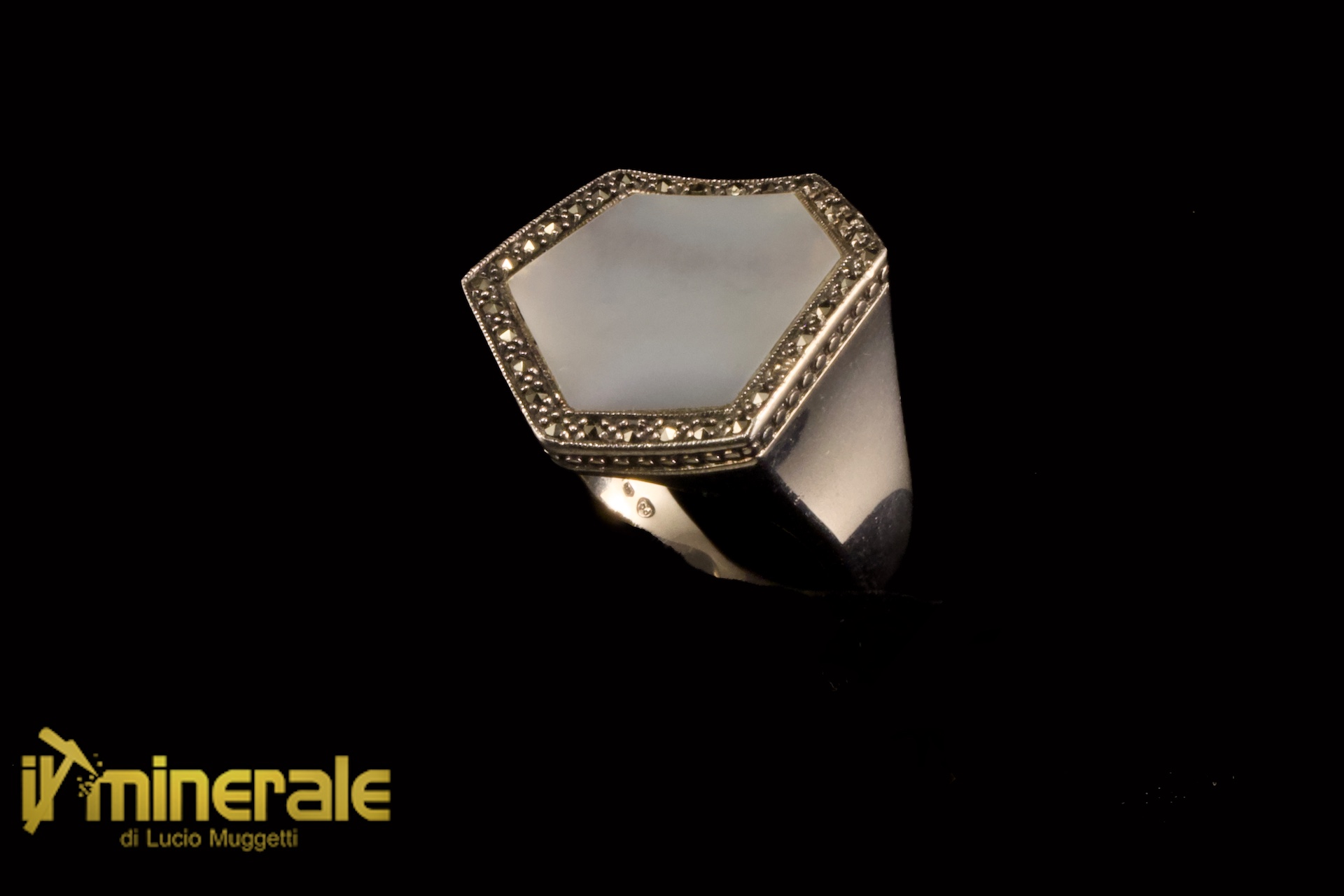 Anello in argento 925 con un esagono irregolare di madreperla contornato da piccole marcassiti sfaccettate