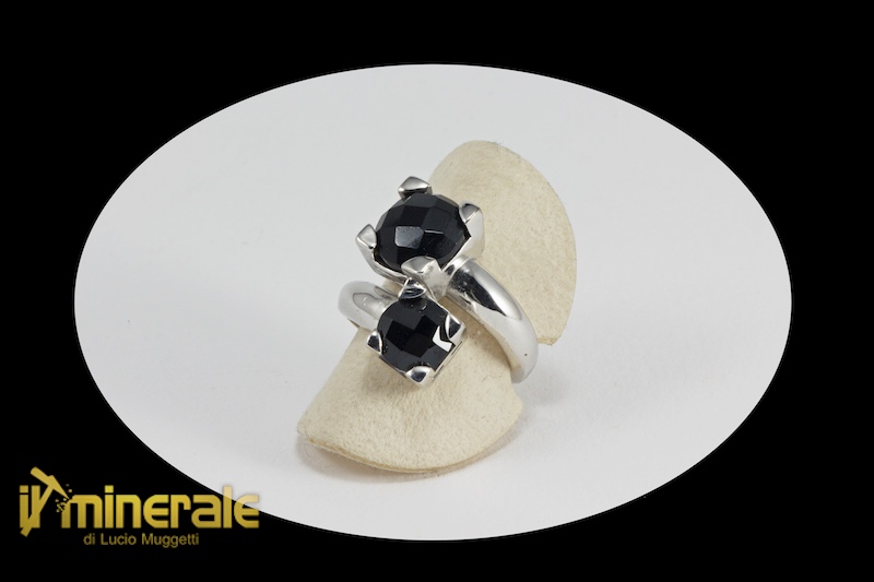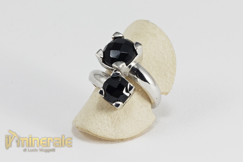 Anello contrariè in argento 925 rodiato con 2 briolette tonde (8 e 10 mm) di onice