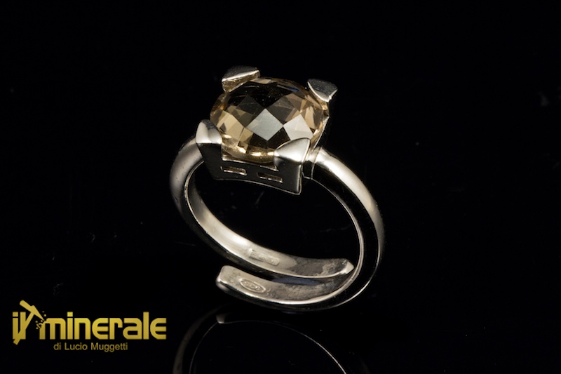 Anello in argento 925 rodiato con una briolette sfaccettata tonda (diametro 10 mm) di quarzo fumè