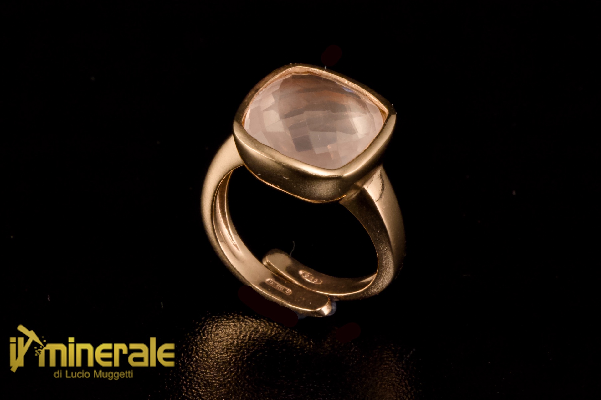 Anello in argento 925 placcato oro rosa con una briolette sfaccettata (12x12 mm) di quarzo rosa