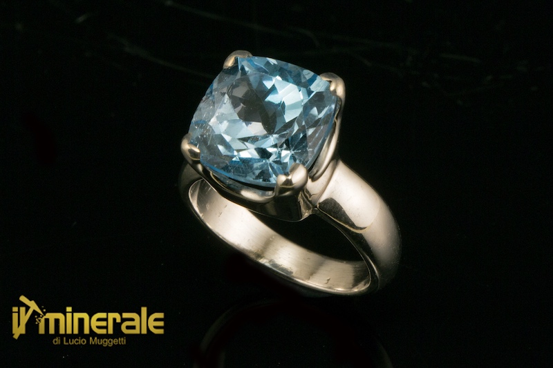 Anello in argento 925 rodiato con una pietra sfaccettata a forma di cuscino (10,5x10,5 mm) di topazio azzurro