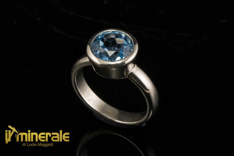 Anello in argento 925 rodiato con una pietra sfaccettata tonda (diametro 9 mm) di topazio azzurro