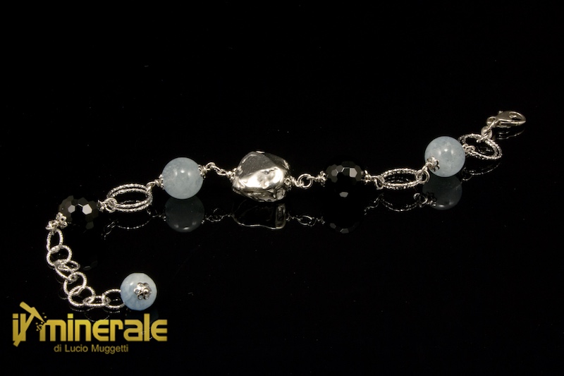 Bracciale incatenato in argento 925 rodiato con 2 sfere di acquamarina lattea (diametro 11 mm) e 2 sfere sfaccettate di onice (diametro 12,5 mm)
