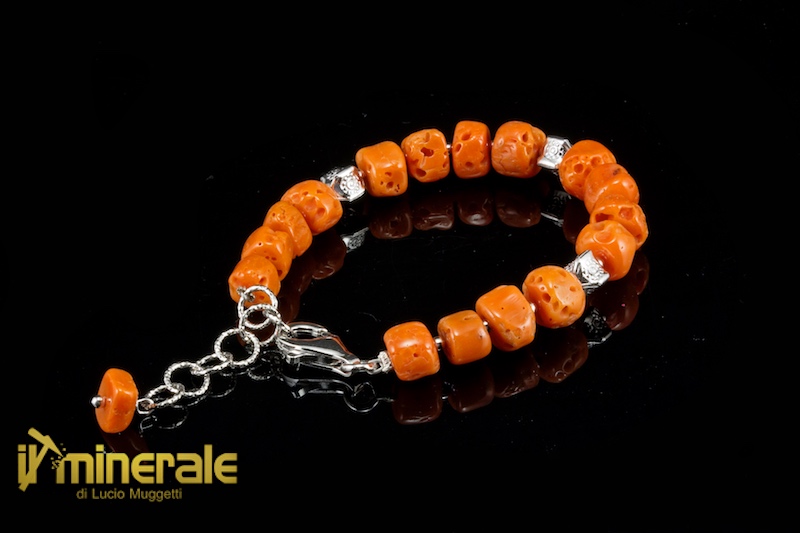 Bracciale con barilotti grezzi di colore rosso-arancio di corallo della dimensione da 6,5x8 a 7x9,5 mm
