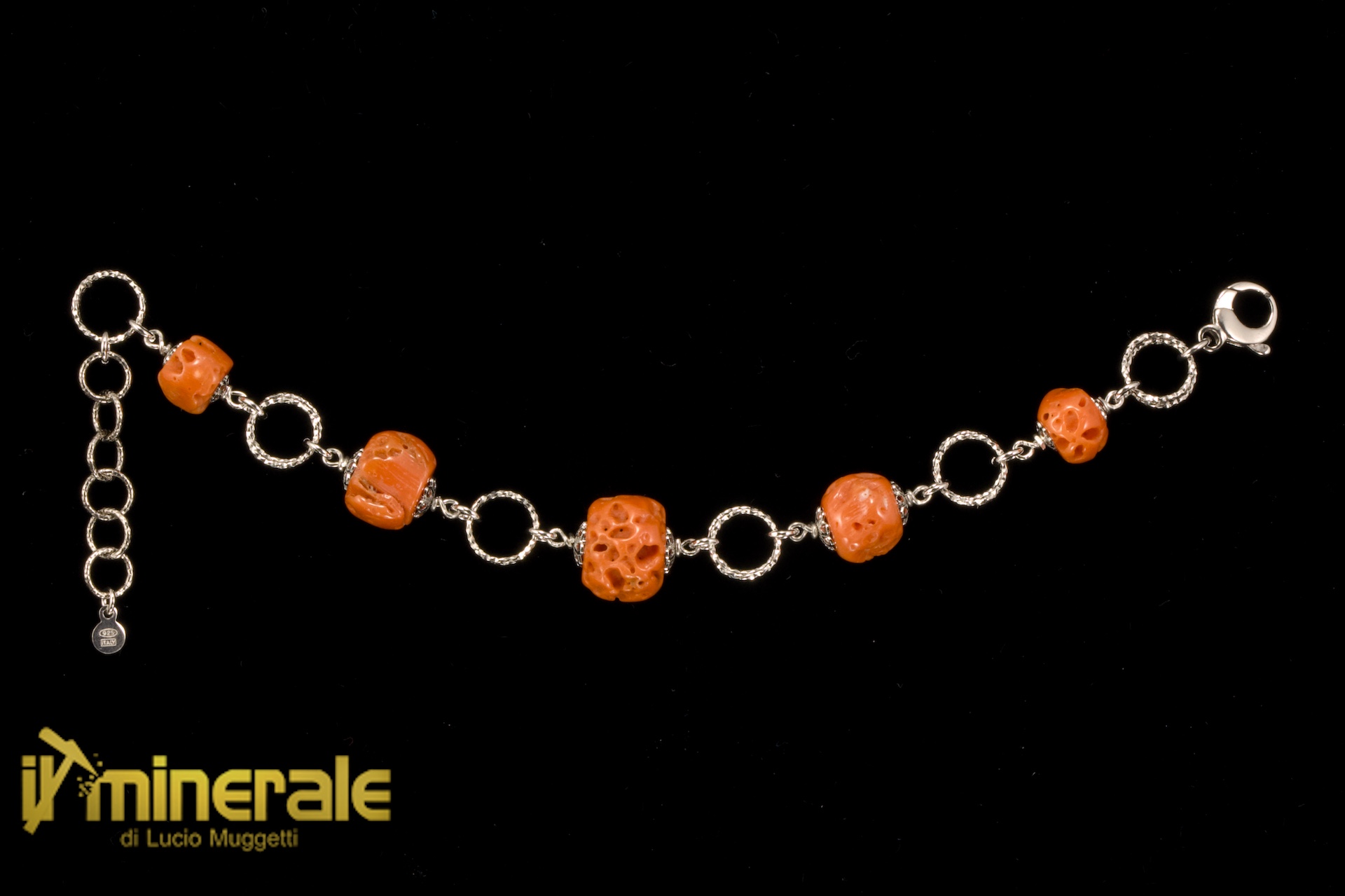 Bracciale incatenato in argento 925 rodiato con rondelle grezze di corallo rosso chiaro del diametro da 10 a 14 mm