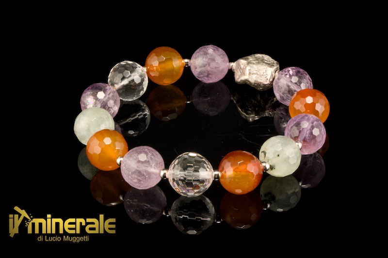 Bracciale elastico con sfere sfaccettate del diametro di 12 mm di ametista, corniola, prehnite e quarzo ialino