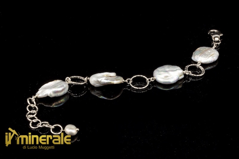 Bracciale incatenato in argento 925 rodiato con 4 perle cotivate d'acqua dolce "coin" di colore grigio della dimensione di 17x20 mm circa