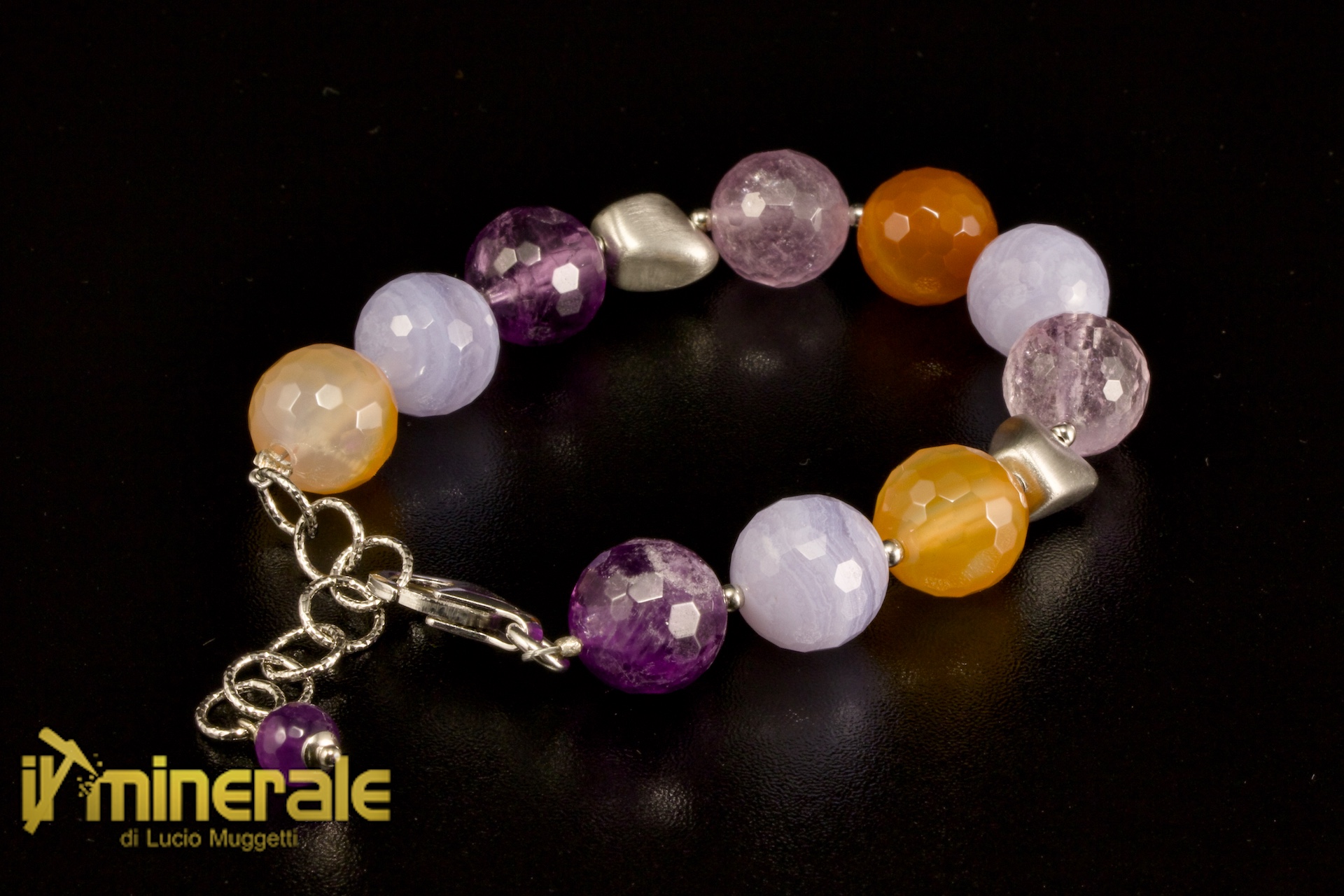 Bracciale composto da sfere sfaccettate del diametro di 12 mm di corniola, calcedonio e ametista