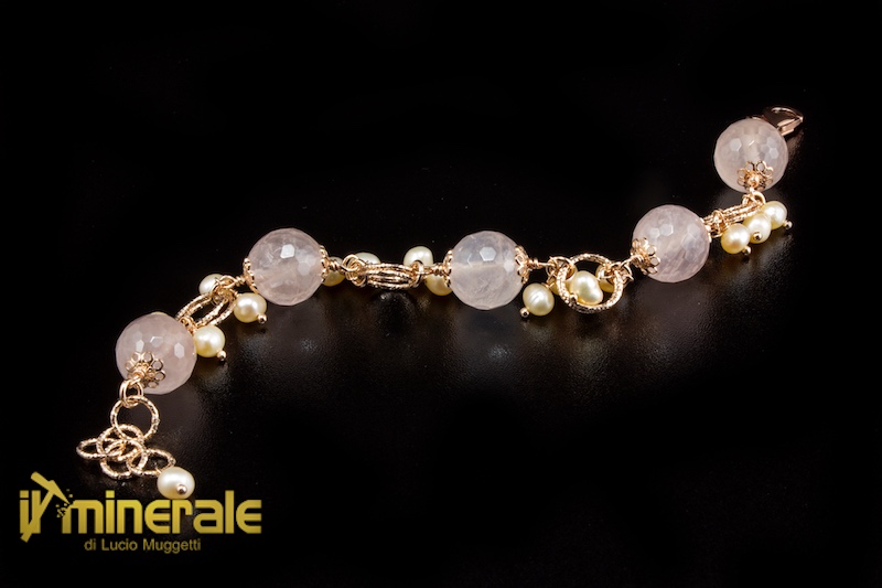 Bracciale incatenato in argento 925 placcato oro rosa con sfere sfaccettate di quarzo rosa (diametro 12 mm) e charms di perle coltivate d'acqua dolce di colore rosa tenue (diametro circa 5 mm)