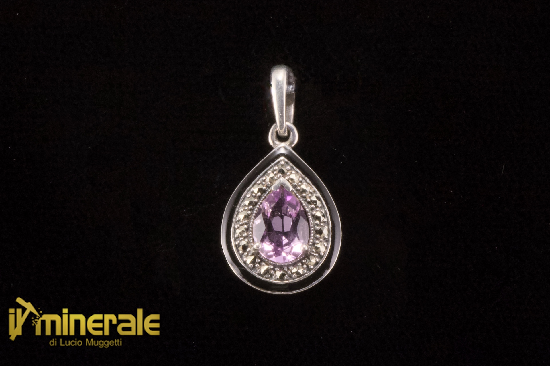 Ciondolo con una goccia sfaccettata di ametista con marcassiti e smalto a fuoco